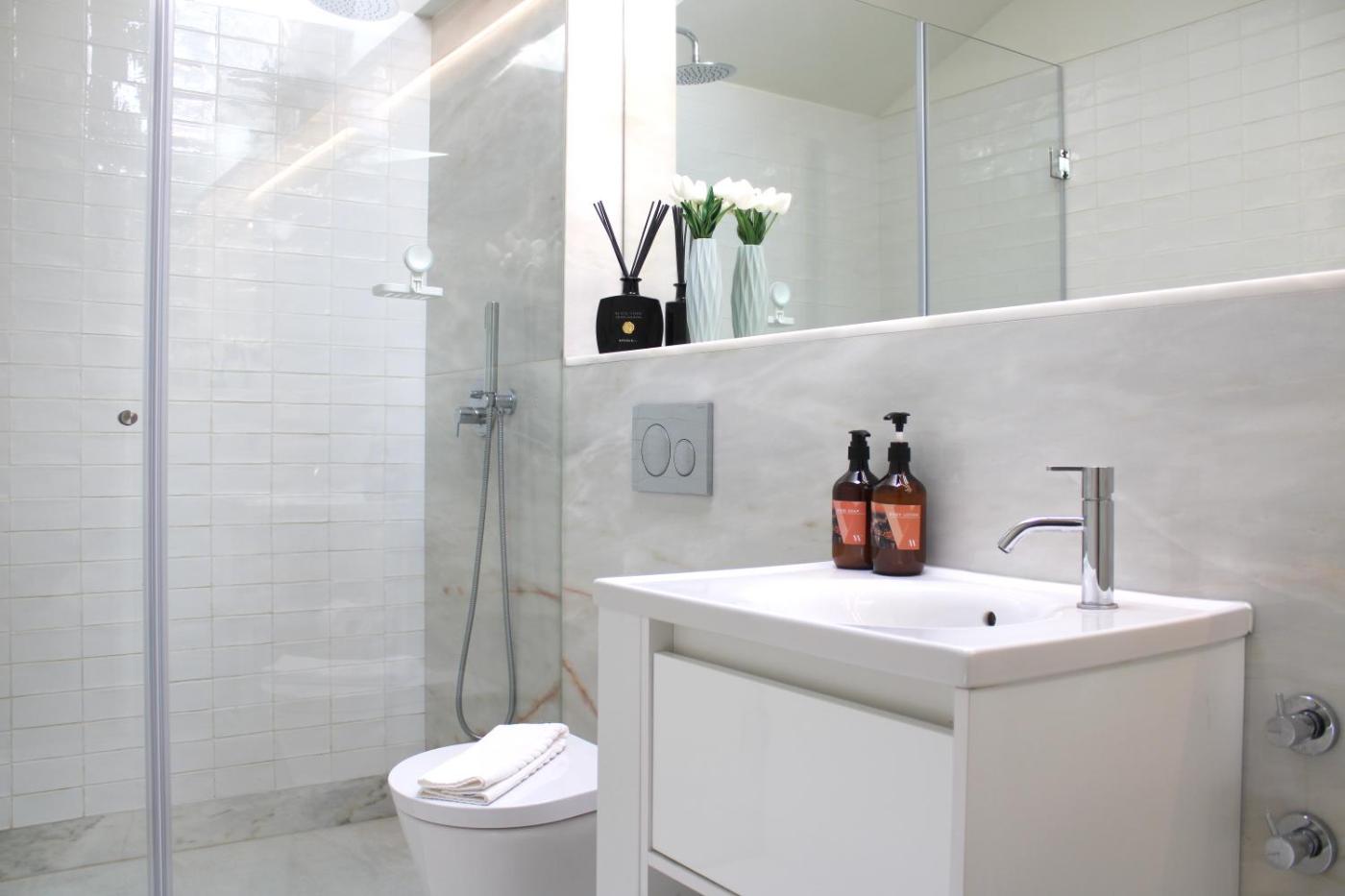 Este apartamento com ar condicionado tem 2 quartos, uma sala de estar, uma cozinha totalmente equipada com frigorífico e máquina de café, e 3 casas de banho com chuveiro e produtos de higiene pessoal gratuitos. Toalhas e roupa de cama são providenciadas neste apartamento.
